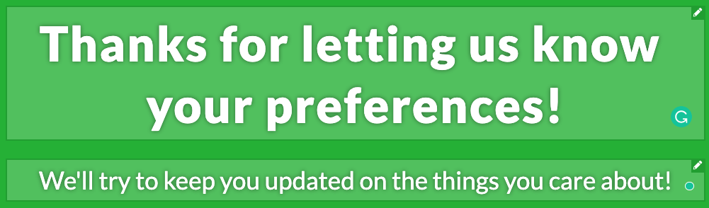 1. After creating your Form you'll be taken to an editable preview of the Thank You page. Edit the text in the two green boxes- your headline, and thank you message. You can do this by simply clicking on the text and editing it as normal.